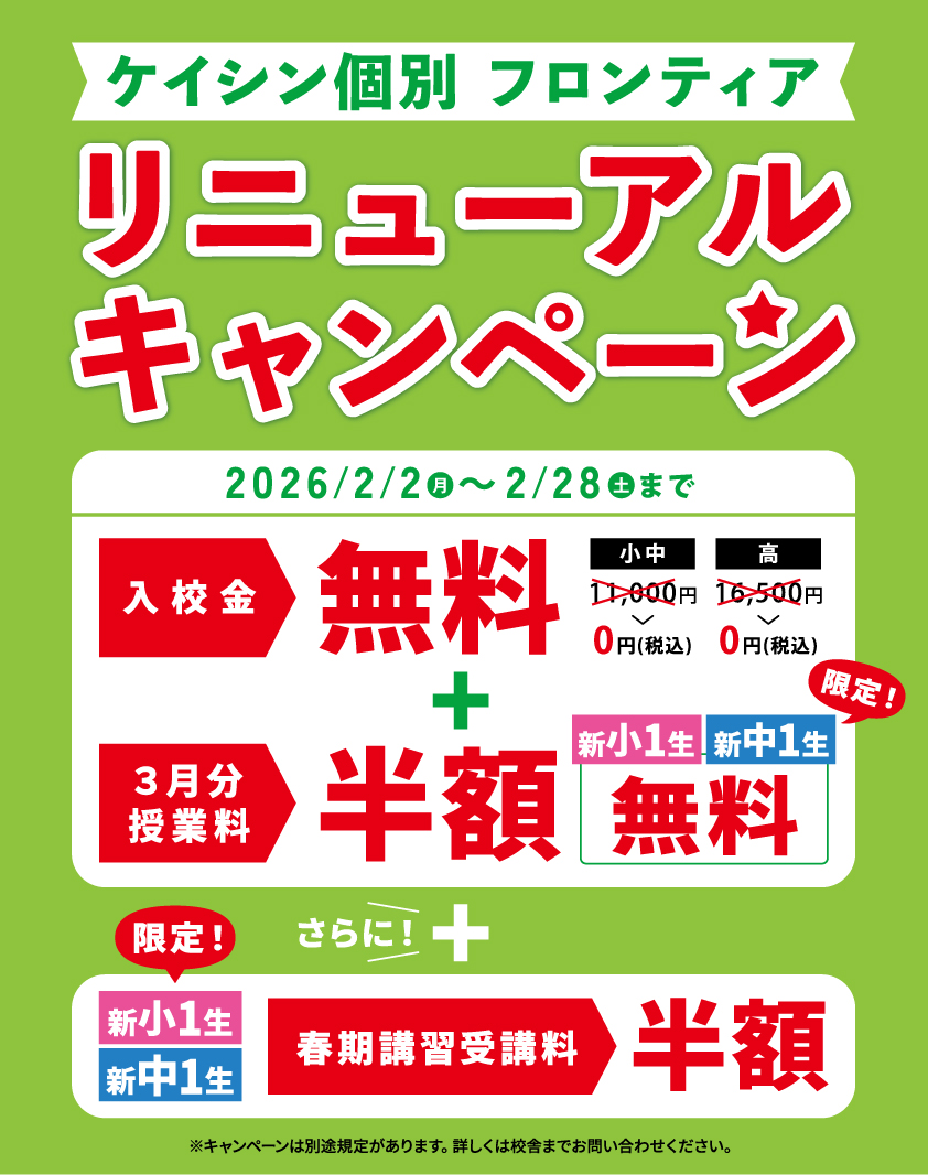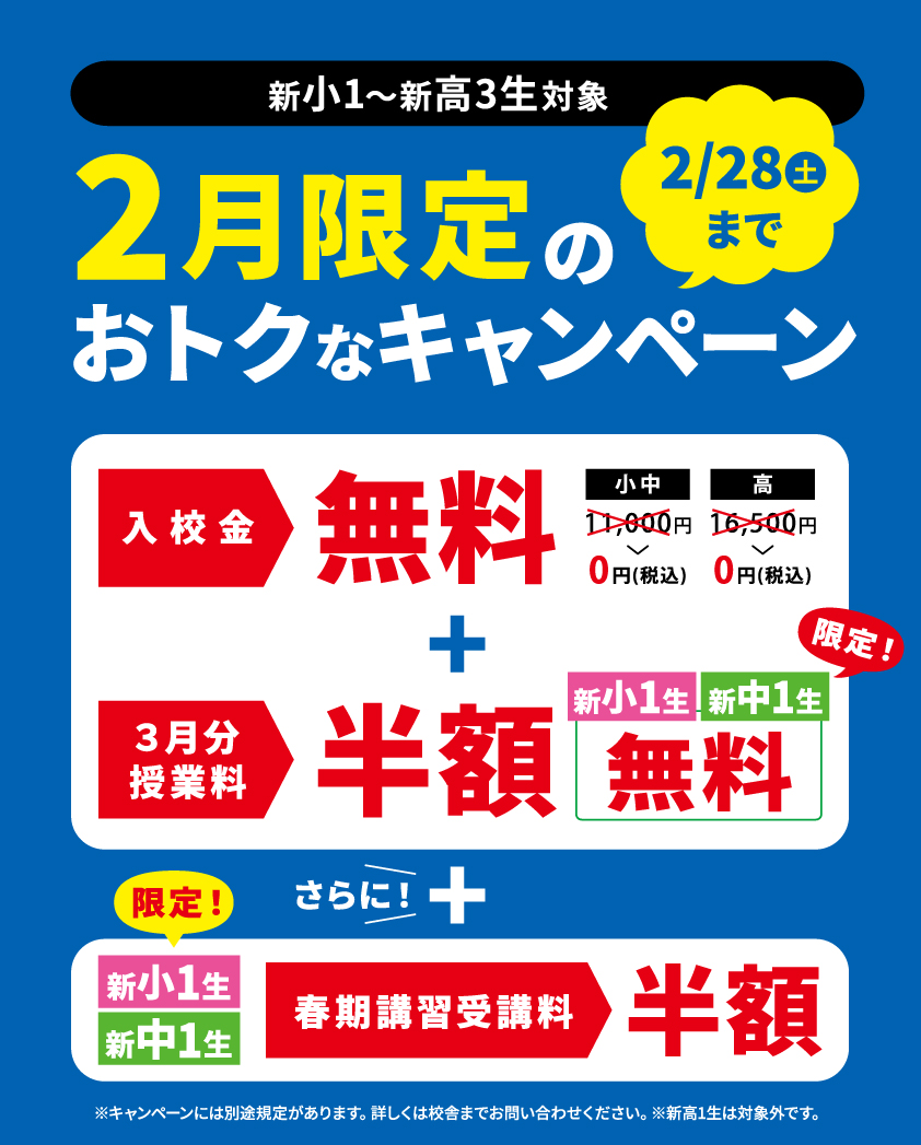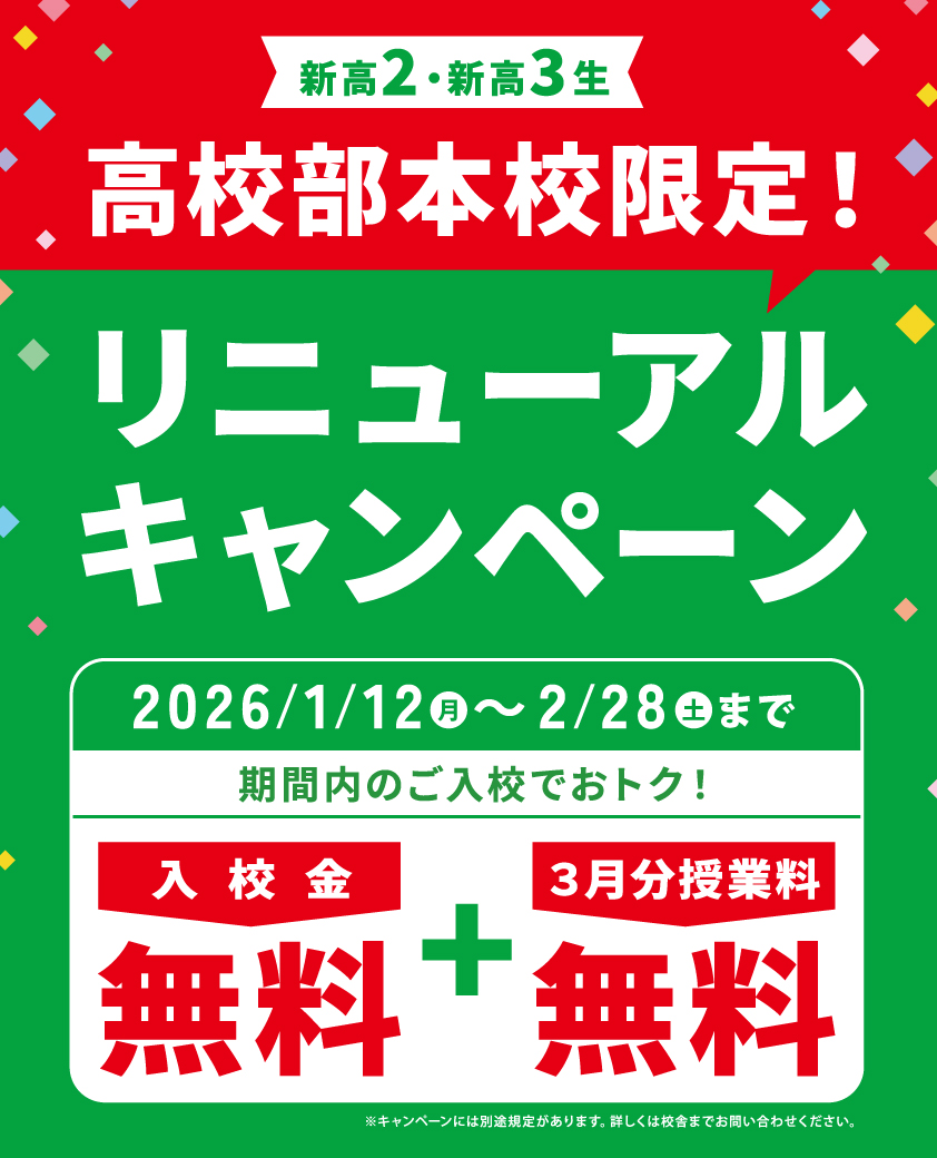 ※キャンペーンには別途規定があります。詳しくは校舎までお問い合わせください。※新高1生は対象外です。